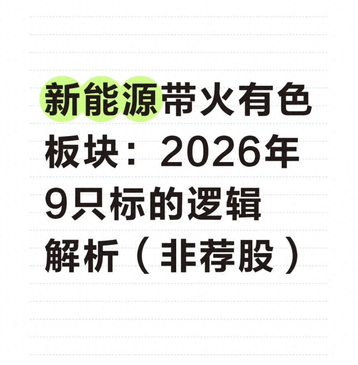 对普通投资者来说,有色板块标的繁多,金属种类复杂,很容易看得眼花缭乱。今天就用最直白的大白话,拆解2026年有色板块的核心投资逻辑,再聚焦9只重点标的,逐一分析它们的上涨逻辑、供需支撑与潜在风险——全程不搞专业术语堆砌,不做收益承诺,只给有价值的行业分析和逻辑梳理,帮大家看懂这波行情的来龙去脉。