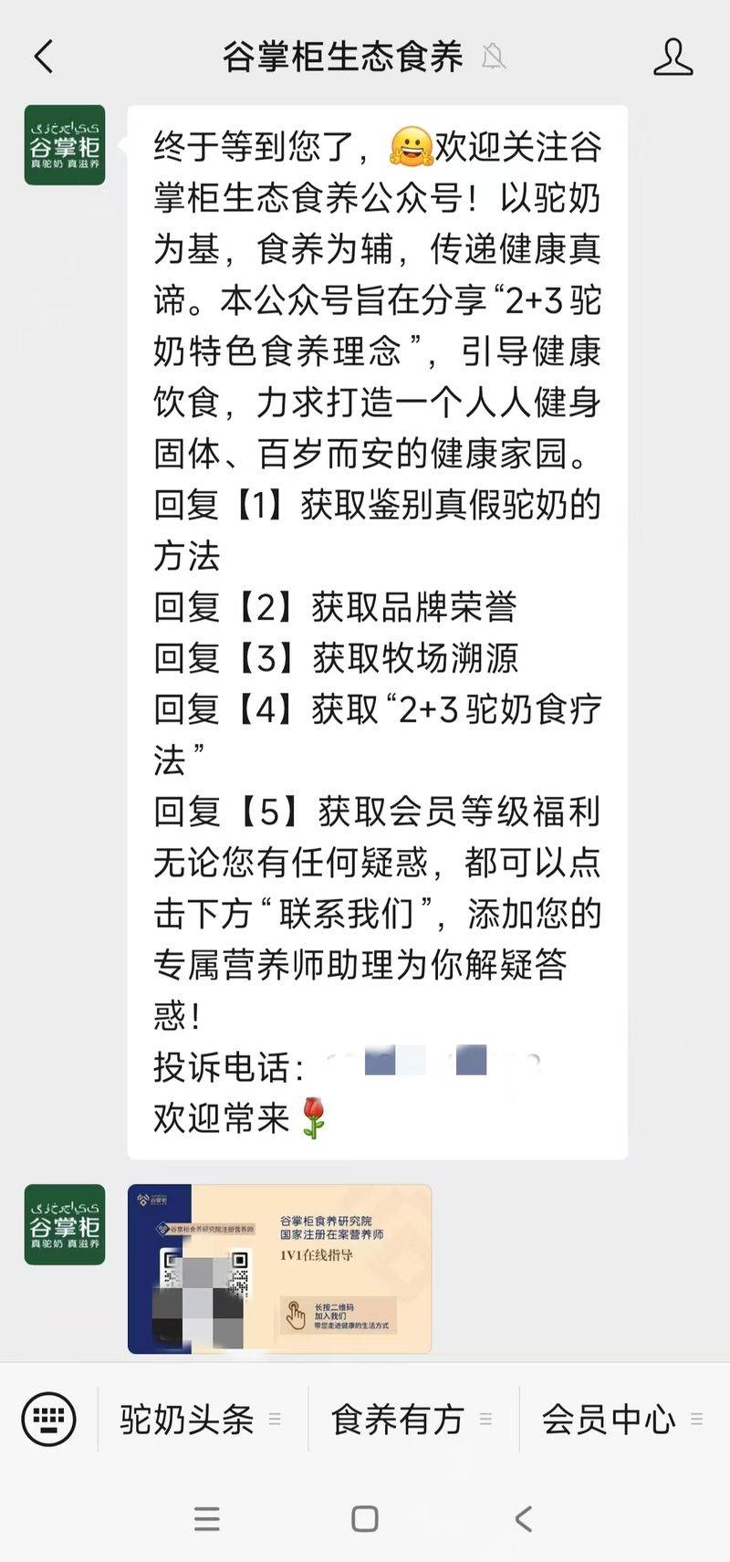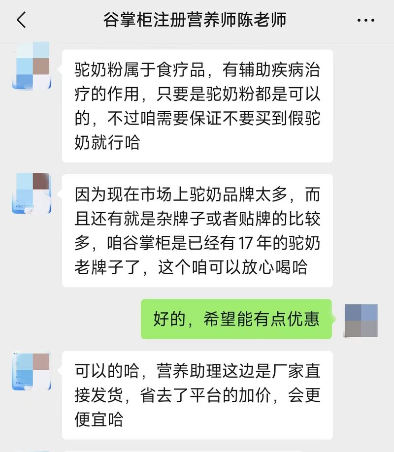 咨询解答完毕后,这位“陈老师”推荐其“营养助理”加新京报记者微信,并称后期可以从“营养助理”那里买产品,“厂家直接发货,省去了平台加价,会更便宜”,“还有生日礼等会员好礼”。随后,一位自称叫“阿依古丽”的谷掌柜营养顾问加了记者微信,称控糖降压推荐喝“谷掌柜有机纯驼乳粉”,并称这款“纯奶”是整个食品大行业安全等级最高的有机食品,“有机纯驼奶也可以说是目前品质最好的骆驼奶,它比普通纯驼奶强,更比配方奶强得多。”