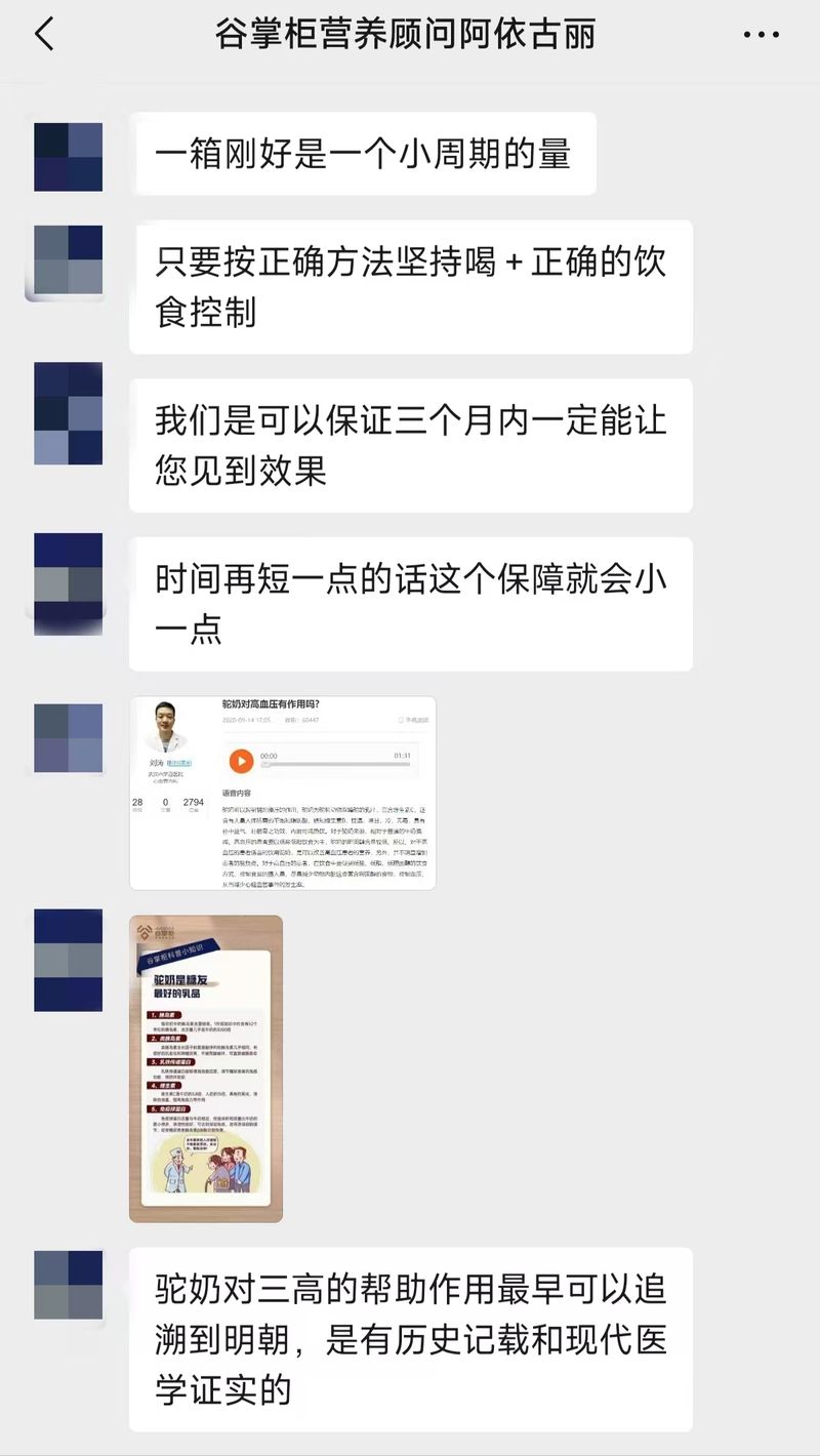 通过该微信公众号,新京报记者以“三高”患者家属身份,添加了一位自称有10年执业经验的谷掌柜营养师。对方称,驼奶粉有辅助疾病治疗的作用,建议高血压老患者更长时间饮用驼奶,以起到滋补血压血管问题及长期吃药对身体的损伤。咨询完毕后,该营养师便向记者推荐其营养助理微信,称购买谷掌柜产品价格更便宜。在推荐产品过程中,营养助理同样会向客户发送驼奶有益降压、降糖的文字和图片内容,并称老用户均反馈效果不错,“可以保证三个月内一定让您见到效果”。