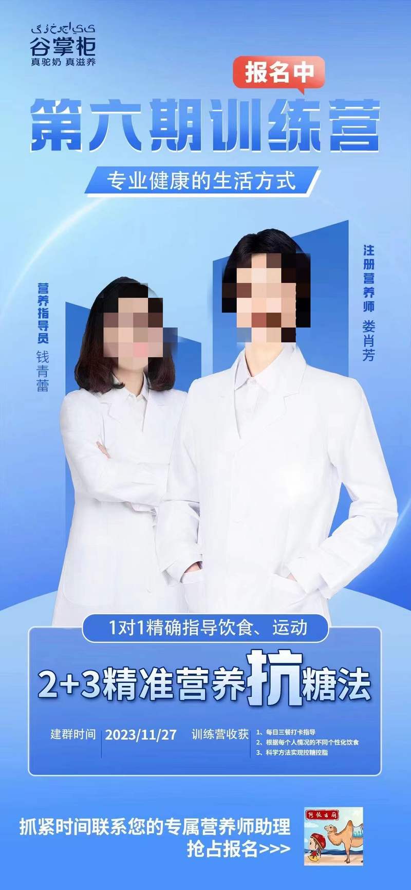 与此同时,文章还分享了“来自5位糖友的真实改善案例”,中间穿插有“谷掌柜有机纯驼乳粉”“谷掌柜益生菌初乳配方驼乳粉”的产品图片及谷掌柜“全国驼奶制品连续三年全网销量第一”的市场地位认证图片。文章开头的图片中则介绍了谷掌柜营养师教练团的7名成员,配文“欢迎您加入谷掌柜食养研究院,您将享受中老年内分泌代谢领域实战教练团三师共管级别服务指导”,并称这支营养师训练团擅长健康评估、糖尿病管理、慢病调理、更年期调理、睡眠管理、体重管理等研发的糖尿病配餐系统。