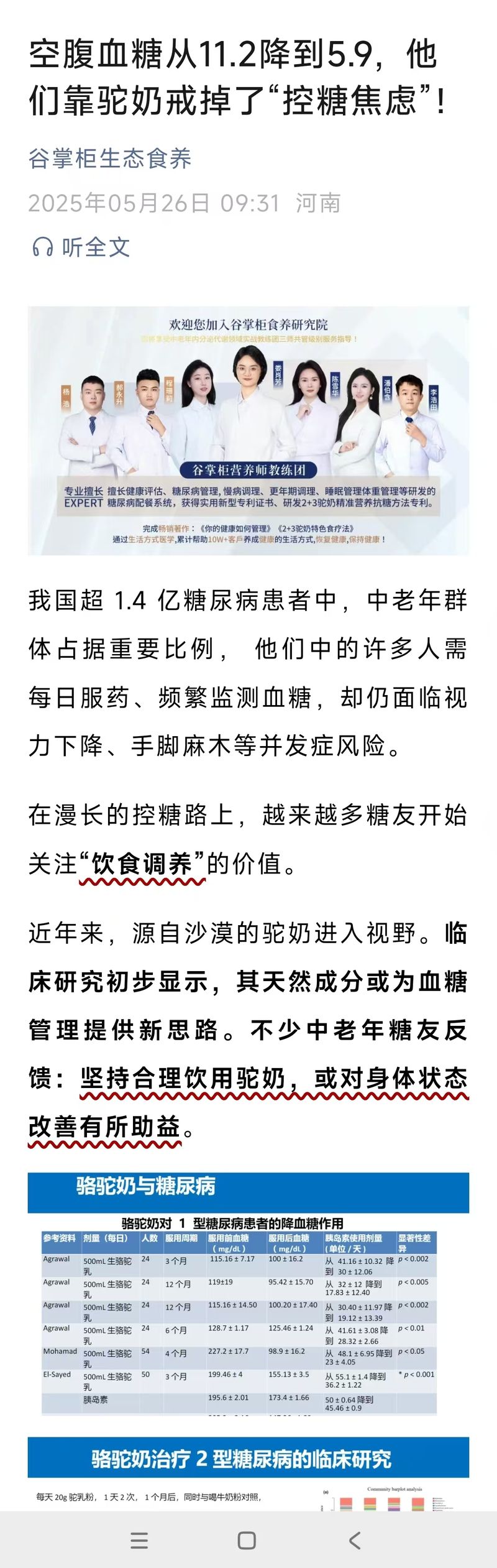 2025年5月26日,该公众号发布一篇题为“空腹血糖从11.2降到5.9,他们靠驼奶戒掉了‘控糖焦虑’”的文章称,“近年来,源自沙漠的驼奶进入视野。临床研究初步显示,其天然成分或为血糖管理提供新思路。不少中老年糖友反馈:坚持合理饮用驼奶,或对身体状态改善有所助益”。