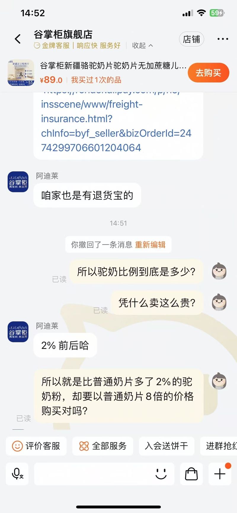 赵丹曾向谷掌柜旗舰店客服提出质疑,“仅因为它比普通奶片多了2%的驼奶粉,消费者就要以普通奶片8倍的价格购买吗?”客服对此回复称,“骆驼奶一般是比较稀有的,驼奶的营养价值高于牛羊奶5-6倍以上,产量也低于牛羊奶很多,咱们的也是双峰骆驼产的奶,产量更少更珍贵”。