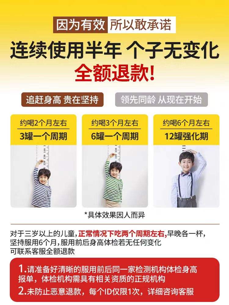 “谷掌柜旗舰店”一款在售的“儿童成长驼乳粉”,在产品页面打出“青少年学生高钙CBP助力高个子”等关键词,并自称“100%真成长助力乳粉”,承诺“连续使用半年个子无明显变化,全额退款”,“对于三岁以上儿童,正常情况下吃两个周期左右,早晚各一杯,坚持服用6个月,服用前后身高体检若无任何变化,可联系客服全额退款”。不过,商家也在产品页面提示,“具体效果因人而异”。