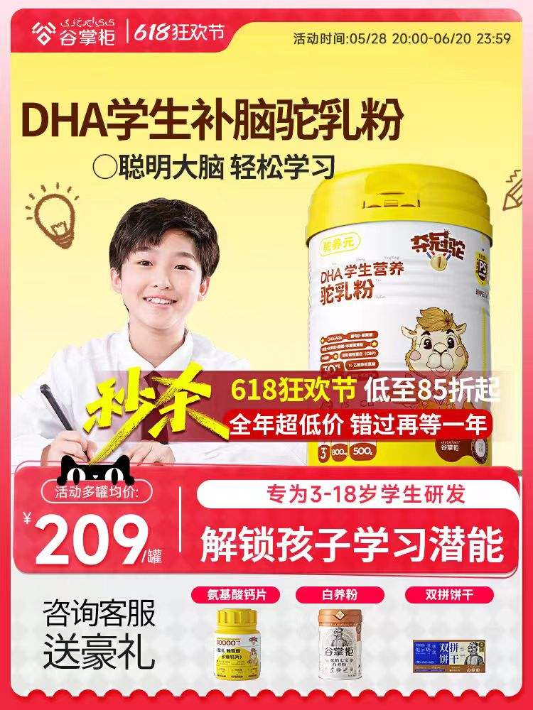 谷掌柜一款“DHA学生营养驼乳粉”宣称“补脑”。 电商截图